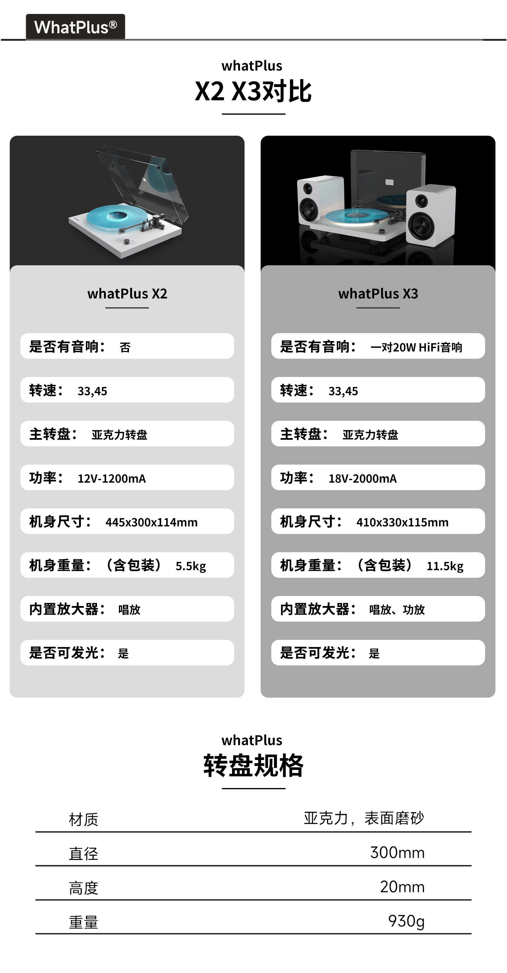WhatPlus X2 质感与体验双优之选!采用高级哑光烤漆与肤感面板,触感温润细腻如婴儿肌肤,且具备耐划痕、抗磨损、不留指纹的特性,防潮抗黄变,经久耐用更省心。创新发光唱盘设计,冷暖双色灯光可随心切换,唱片转动时光晕随音乐流转,宛如流动的光影艺术,氛围感十足。搭载碳纤维唱臂,质刚而轻,内部阻尼结构能有效抑制谐振,搭配专业平衡音质装置,让唱头循迹更精准稳定,还原纯粹细腻的听觉体验。