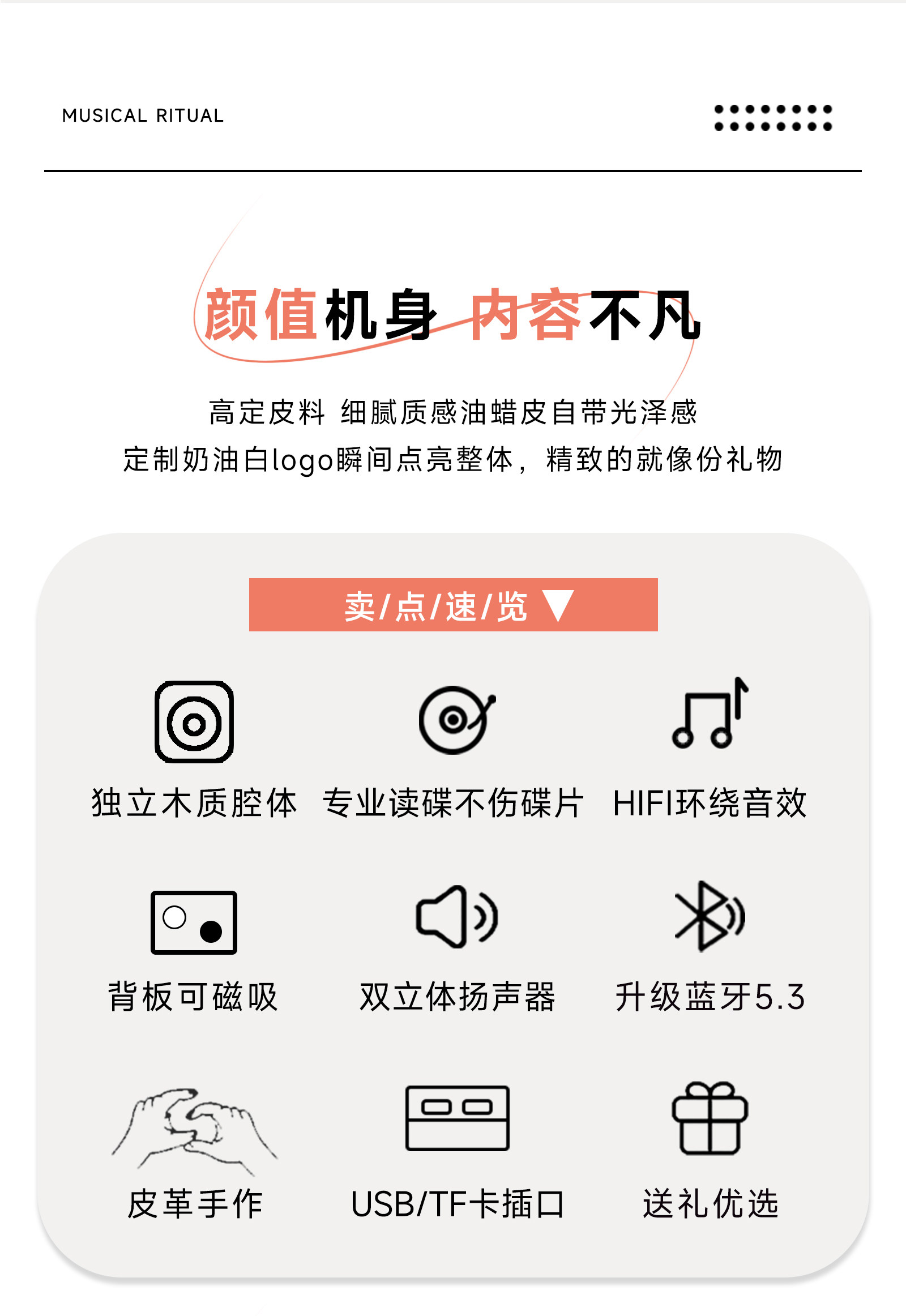 WhatPlus 问加 C300 专为追星族打造!外观复古雅致,木质机身搭配仿皮革包裹,能融入各种风格,是粉丝房间的特色摆件,彰显个性态度。专属磁吸背板设计,无需繁琐粘贴,本命周边一靠即吸,轻松更换痛机风格;日常通勤携带、衣柜储物收纳皆可,随时切换展示风格,热爱个性随心表达。多种应援色可选,精准契合追星审美,支持 CD 播放功能,让你尽情播放偶像专辑,享受原汁原味的音乐,感受实体唱片的独特魅力 —— 不是冰冷的数字串流,而是能触摸的心跳频率,这台 CD 机里藏着你为他尖叫过的每一个舞台现场。HiFi 级音质调校搭配双喇叭,专业激光拾音头加持,带来立体环绕的沉浸式聆听体验。